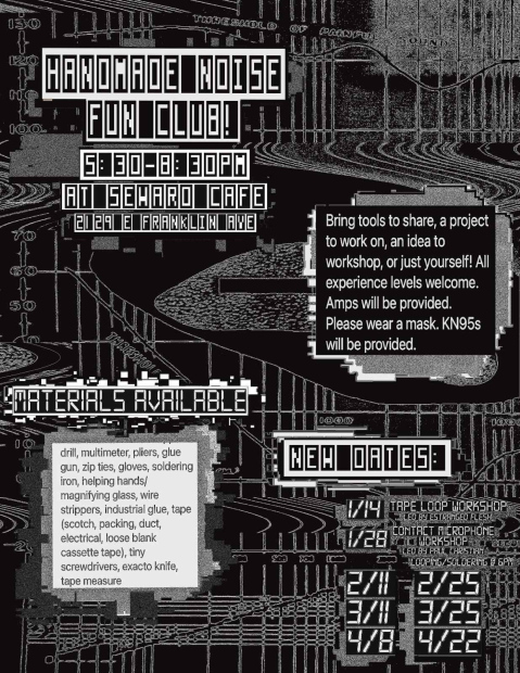 Handmade Noise Fun Club! Venue Seward Cafe 2129 E Franklin Ave Minneapolis, MN 55404 United States TimeTue, Jan 14 2025, 5:30 - 8:30pm Genres Noise Experimental Ambient Age Limit All Ages