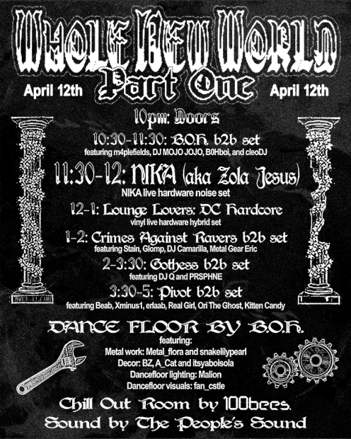 Whole New World TimeSat, Apr 12 2025, 10pm - Sun, Apr 13 2025, 5am Promoter Super EQ Team Artists mojo jojo B0Hboi cleoDJ Zola Jesus Lounge Lovers DJ Cumstain DJ Glomp DJ Camarilla Metal Gear Eric DJ Q PRSPHNE Beab Xminus1 Erlaab Real Girl OriTheGhost Kitten Candy Genres Hardcore Happy Hardcore Breaks Techno Electro EBM Goth Ticketssupereqteam.com
